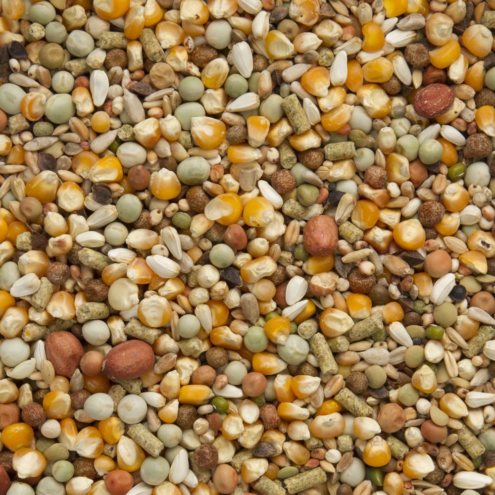 Kleine cribbs maïs 22%, cardy 7%, groene erwten 6%, maple peas 6%, dari 5%, dunpeas 5%, kleine groene erwten 5%, popcorn maïs 5%, sorgho rood 5%, tarwe 5%, Goldcorn 5%, gepelde pinda’s 2%, boekweit 2%, gepelde haver 2%, kadjang idjoe 2%, koolzaad 2%, lijnzaad 2%,  linzen 2%, paddy rijst 2%, vitsen/wikken 2%, gepelde zonnebloempitten 2%, kempzaad 1%, witte millet 1%, sesamzaad 1%, kanariezaad 1%