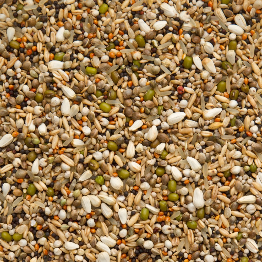 Gepelde haver, koolzaad, witte millet, hennepzaad, kanariezaad, witte sorghum, tarwe, zilvervliesrijst, sesamzaad, rode sorghum, saffloerzaad, mungobonen