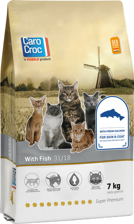 Katten zijn dol op vis. CaroCroc With Fish is een smakelijke voeding met vis en afgestemd op de behoeften van volwassen katten. CaroCroc With Fish is licht verteerbaar en stimuleert een gezonde huid en vacht.
