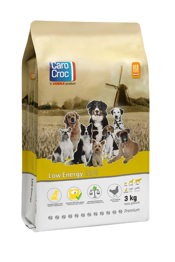 Heeft uw hond in verhouding niet zoveel beweging of heeft uw hond de neiging om dik te worden dan is CaroCroc low energy een zeer goede hondenbrok.