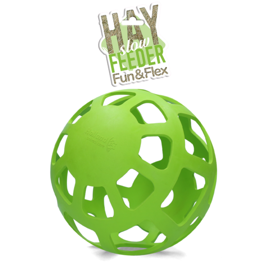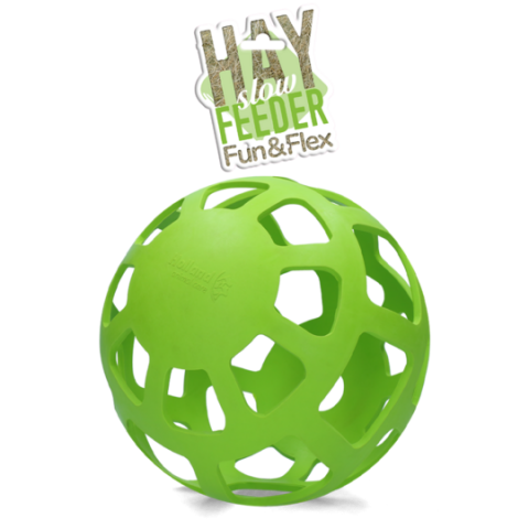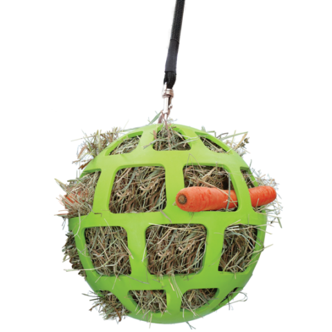 Je kunt deze slow feeder bal vullen met hooi en ander lekkers, zoals wortels, kruiden, stukjes appel ed.  zodat je paard lekker lang bezig is.