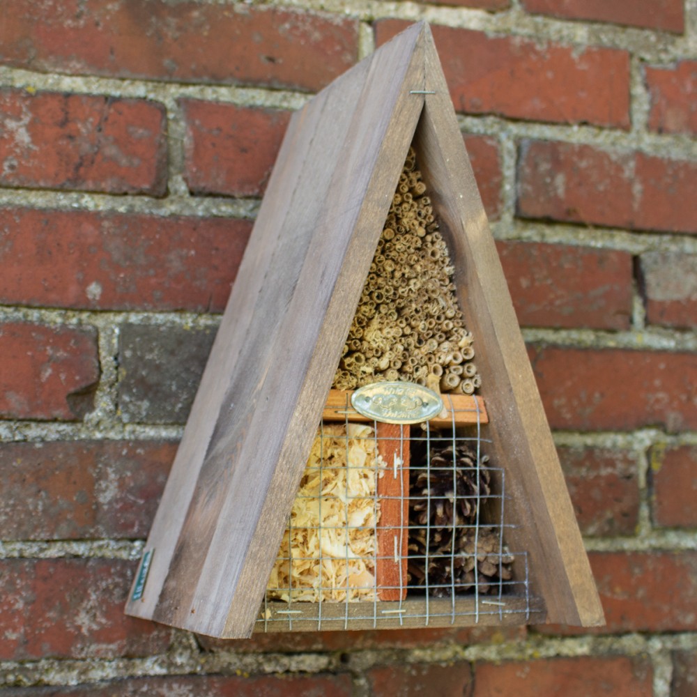 Dit driehoekige insectenhotel wordt vooral gebruikt door solitaire bijen, groene gaasvlieg, oorwormen en lievenheersbeestjes.