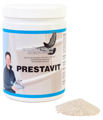 Embregts-Theunis Prestavit is een product dat bevat eiwitten, essentiële aminozuren, vitaminen, mineralen en grondstoffen die het spierherstel en de algehele gezondheid van je duiven ondersteunen.