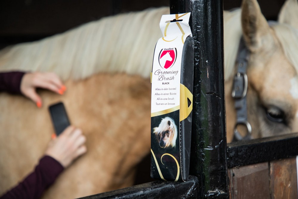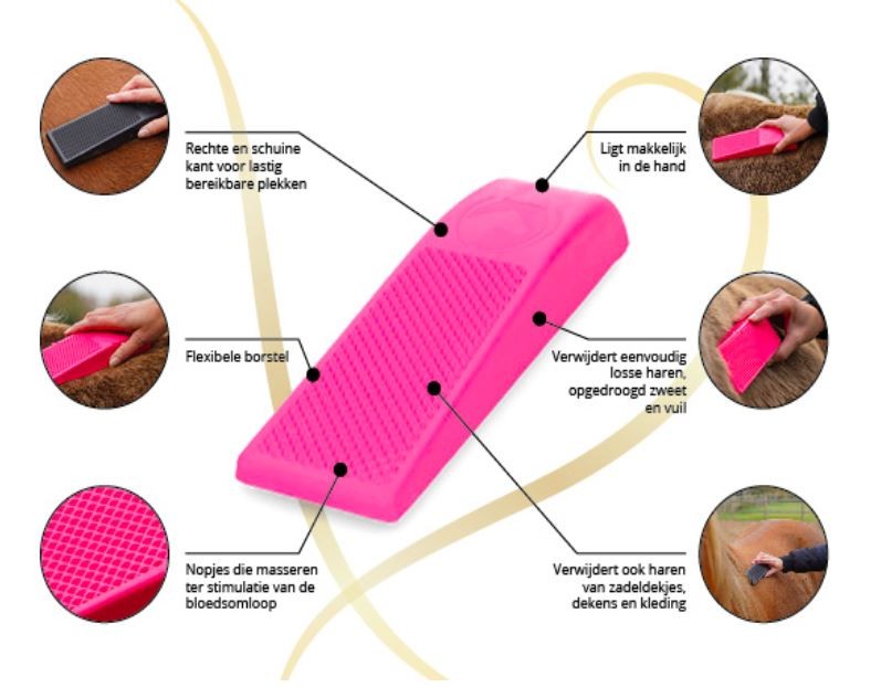 Deze multifunctionele borstel verwijdert eenvoudig losse haren van het paard.