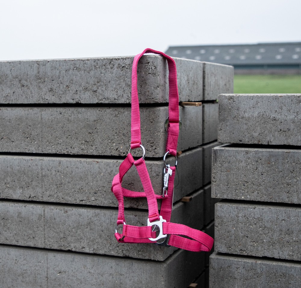 Dit basis halster voor paarden gemaakt van sterk nylon, is voorzien van zilverkleurig beslag, en is ruim verstelbaar.