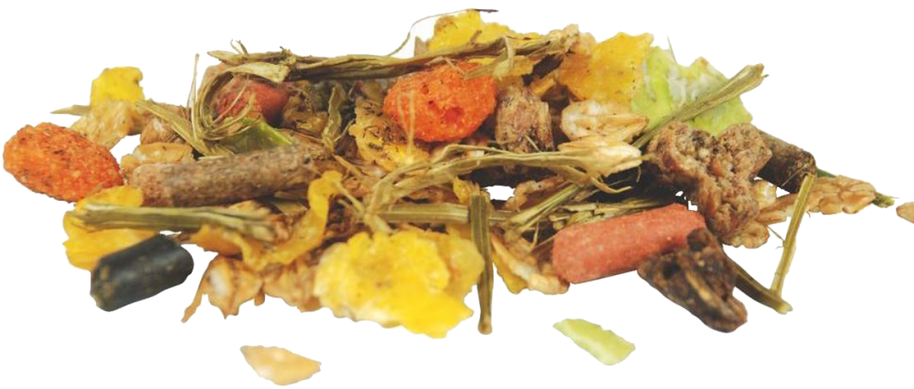 Gerstvlokken, Maïsvlokken, Haverzemelen, Zonnebloemzaadschroot, Luzerne, Erwtenvlokken, Lijnzaad, Tarwegries, Rietmelasse, Lijnzaadolie, Tarwe, Calciumcarbonaat, Maïs geëxtrudeerd, Cichoreipulp, Cichoreiwortel, Gerst, Natriumchloride, Monocalciumfosfaat, Magnesiumoxide, Maïskiemen, Rode biet, Kurkuma, Kruiden.