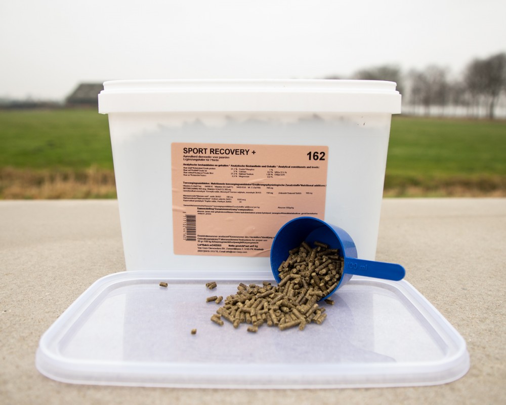 De Sport Recovery voor paarden bevat een groot aandeel natuurlijke bronnen van B-vitamines, E-vitamines, magnesium, ijzer, zink en furaline zuur als antioxidant.