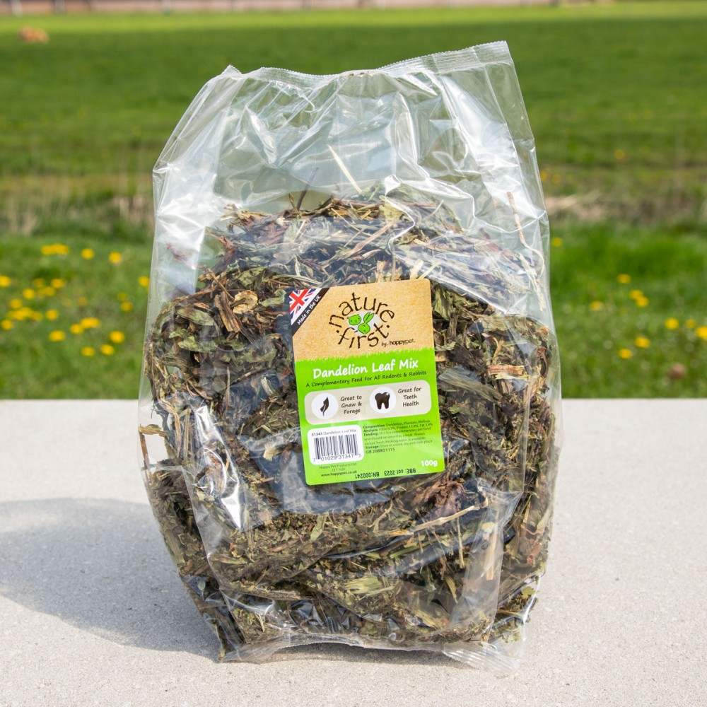 De Nature First Bladmix Paardenbloem van 100 gr is aanvullend voer voor knaagdieren en konijnen, een heerlijke natuurlijke snack uit paardenbloem, weegbree en melisse.