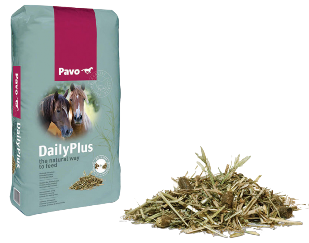 Pavo DailyPlus is uitgebalanceerd ruwvoer (voedingswaarde gelijk aan goed hooi) dat je mengt met krachtvoer om kauwen en de speekselproductie van je paard te stimuleren.