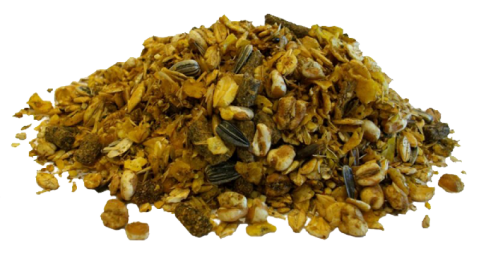 Tarwezemelen, geplette haver, lijnzaadschilfers, gepunte haver, gepofte Mais, rietmelasse, gepofte tarwe, lijnzaad, tarwezetmeel, sojaolie, vitaminen - mineralen