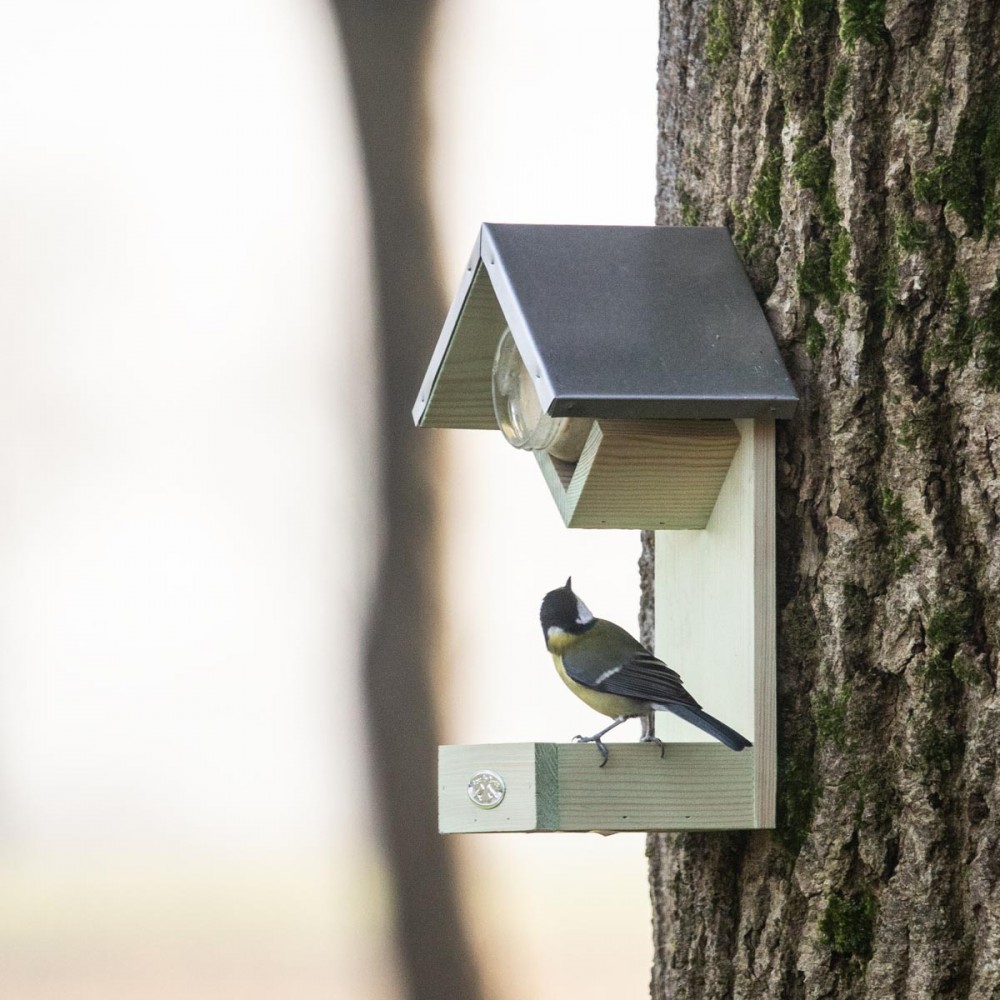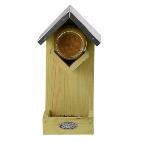 Een aantrekkelijke manier om de buitenvogels te voederen met een houder voor een vogelpindakaaspot en een bakje voor voer.