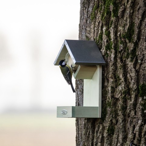 Het combi voederstation is gemaakt van vurenhout met een zinken zak.