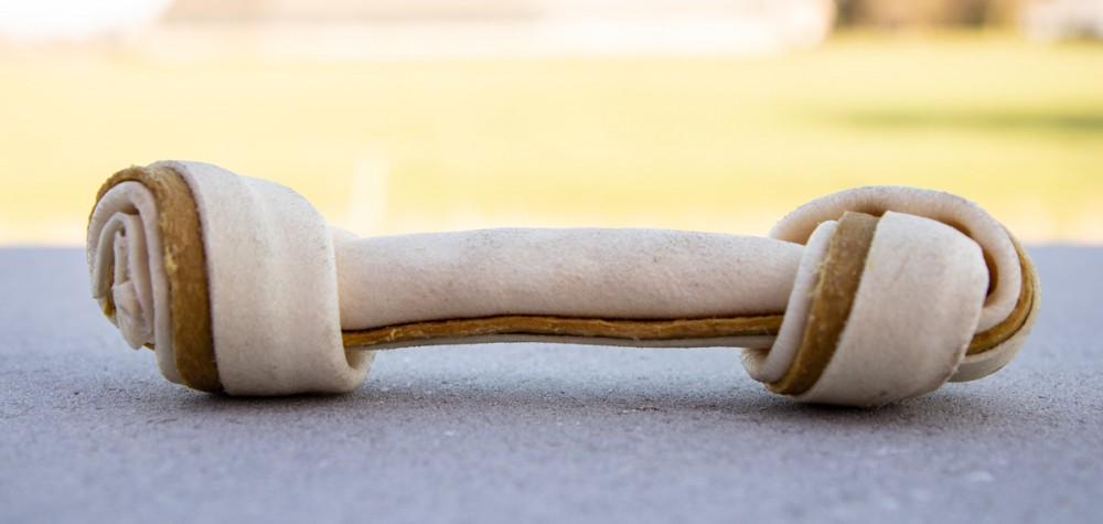 Dit kauwbot met 2 knopen is gemaakt van wit buffelhuid.