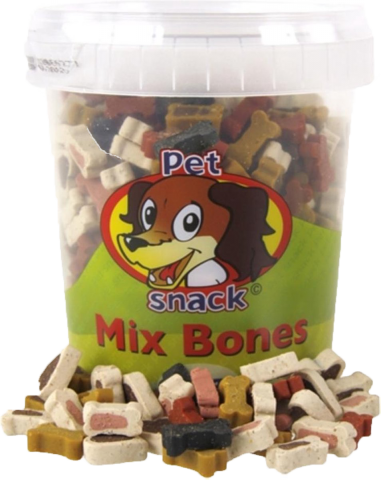 De snacks zijn in de vorm van botjes en hartjes.