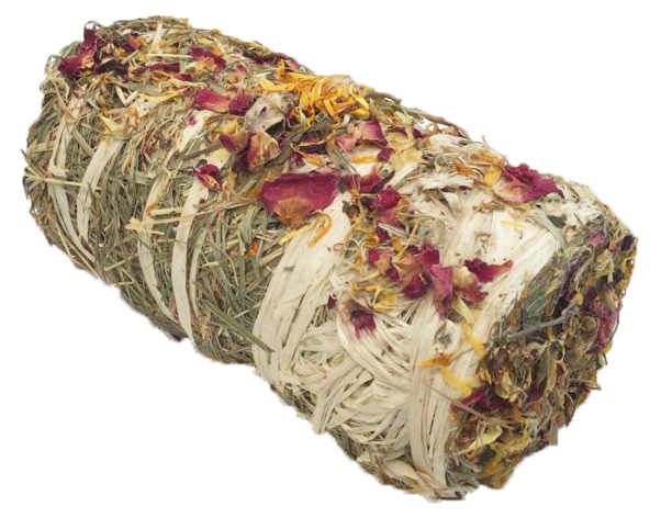 Dit kleine hooibaaltje bestaat uit heerlijk vers hooi met bloesems en omwikkeld met henneptouw.