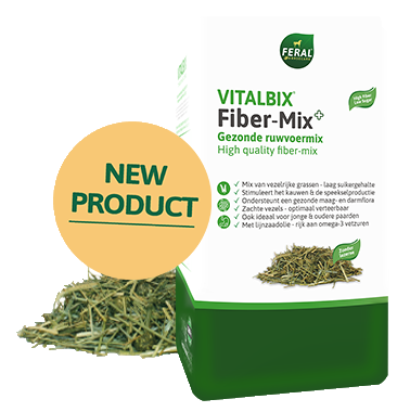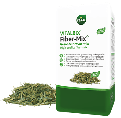 Vitalbix Fiber-Mix is een unieke ruwvoermix van gezonde grassen met een laag suikergehalte en timothee structuurbrok, aangevuld met 3% lijnzaadolie.